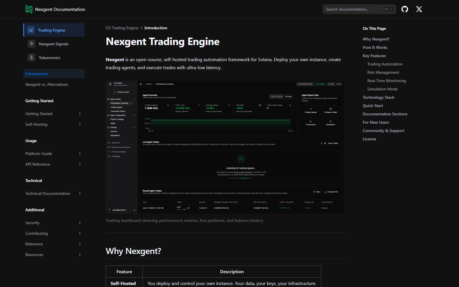 Nexgent AI currently operates in a simulation-only environment. Agents execute trades using real market data from the Solana blockchain, but all activity takes place off-chain using virtual funds. This allows you to safely test strategies, analyze performance, and refine your risk settings without risking real capital.